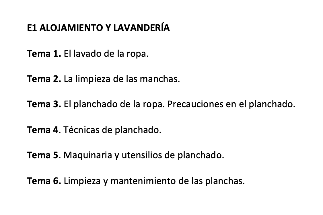 Este temario, formado por 6 temas, ha sido diseñado con el propósito expreso de ofrecer un material completo y profundamente didáctico que permita a los candidatos enfrentarse con éxito a la fase de oposición del proceso selectivo de la especialidad E1 – ALOJAMIENTO Y LAVANDERÍA para ingreso por acceso libre y acceso por promoción interna como personal laboral fijo sujeto al IV Convenio colectivo único para el personal laboral de la Administración General del Estado.