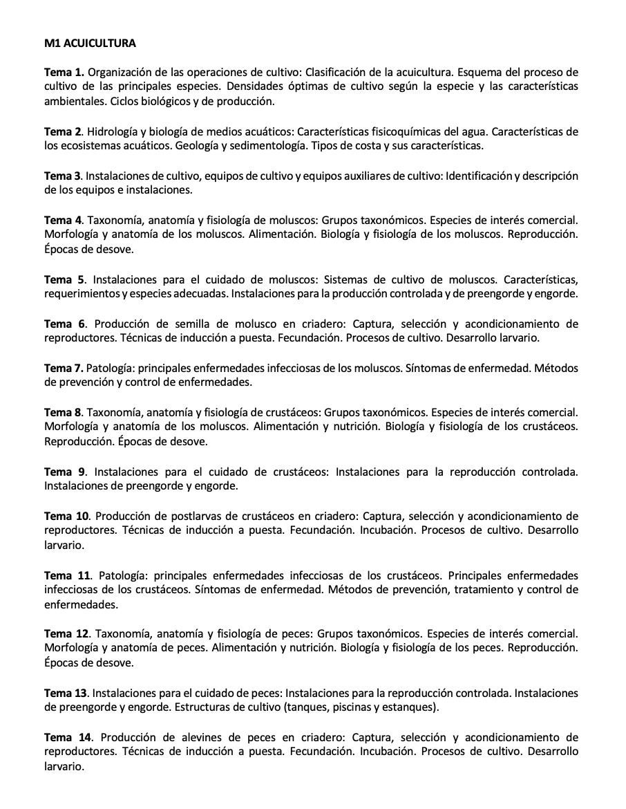 Este temario, formado por 14 temas, ha sido diseñado con el propósito expreso de ofrecer un material completo y profundamente didáctico que permita a los candidatos enfrentarse con éxito a la fase de oposición del proceso selectivo de la especialidad M1 – ACUICULTURA para ingreso por acceso libre y acceso por promoción interna como personal laboral fijo sujeto al IV Convenio colectivo único para el personal laboral de la Administración General del Estado.