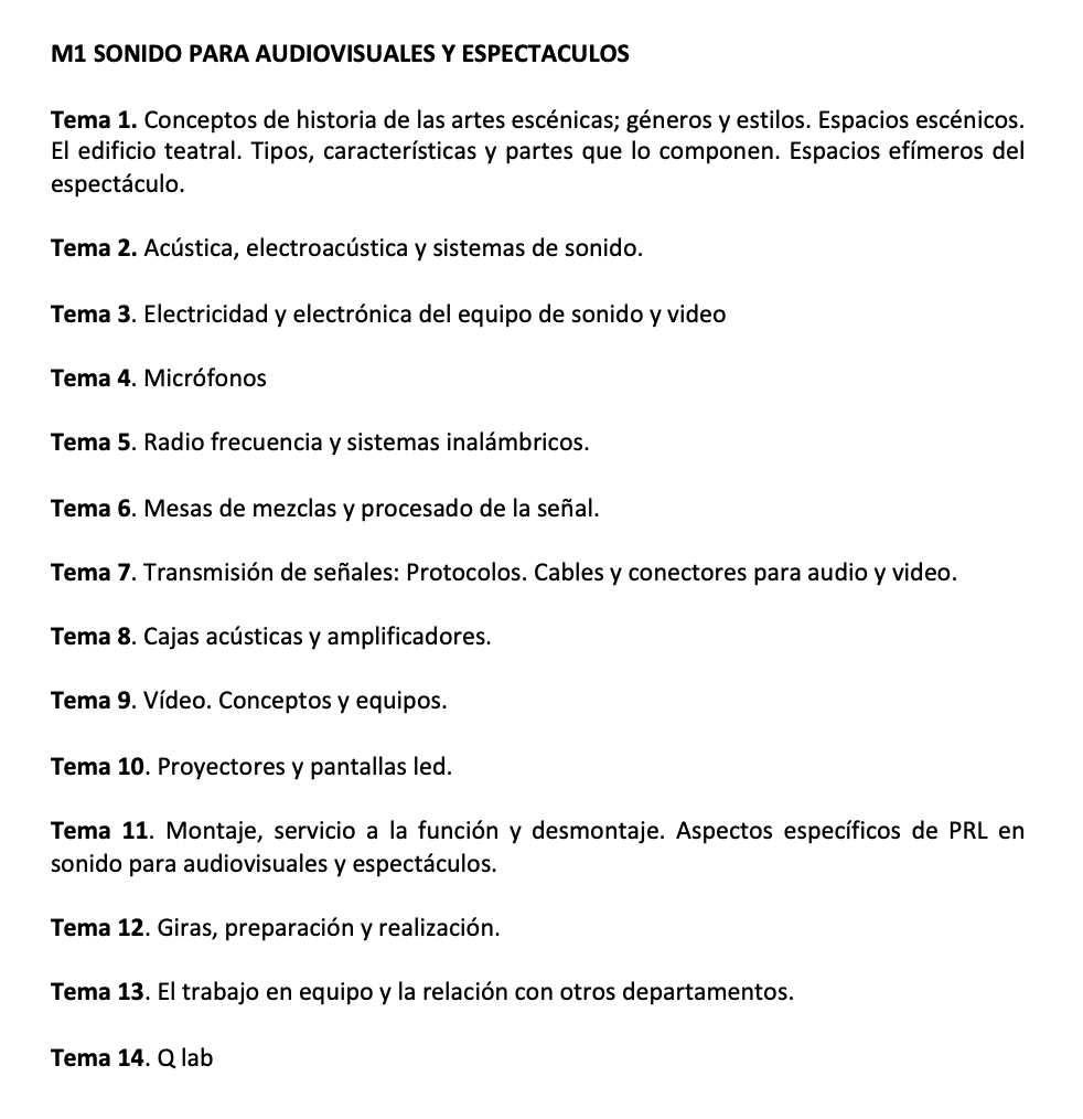 Este temario, formado por 14 temas, ha sido diseñado con el propósito expreso de ofrecer un material completo y profundamente didáctico que permita a los candidatos enfrentarse con éxito a la fase de oposición del proceso selectivo de la especialidad M1 – SONIDO PARA AUDIOVISUALES Y ESPECTÁCULOS para ingreso por acceso libre y acceso por promoción interna como personal laboral fijo sujeto al IV Convenio colectivo único para el personal laboral de la Administración General del Estado.