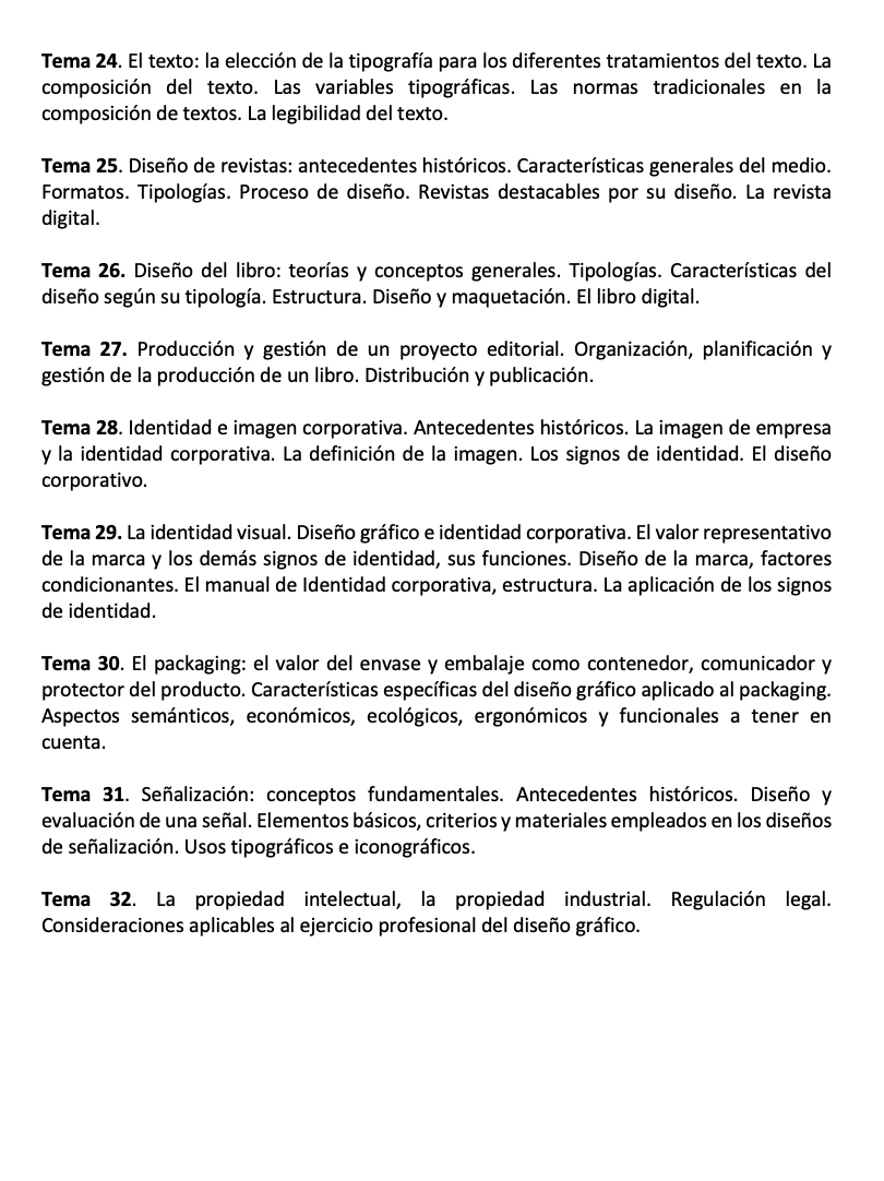 Este temario, formado por 32 temas, ha sido diseñado con el propósito expreso de ofrecer un material completo y profundamente didáctico que permita a los candidatos enfrentarse con éxito a la fase de oposición del proceso selectivo de la especialidad M2 – DISEÑO GRÁFICO para ingreso por acceso libre y acceso por promoción interna como personal laboral fijo sujeto al IV Convenio colectivo único para el personal laboral de la Administración General del Estado.