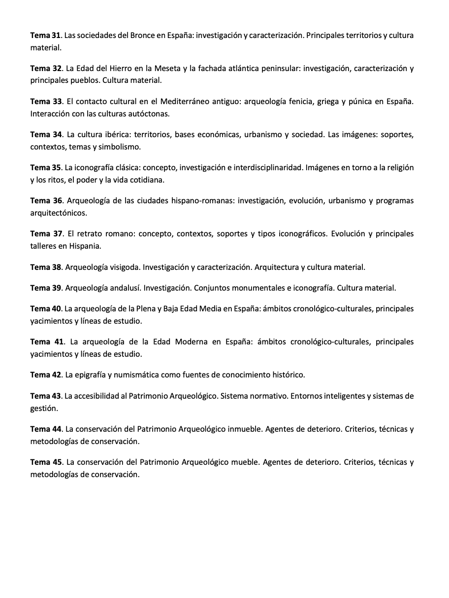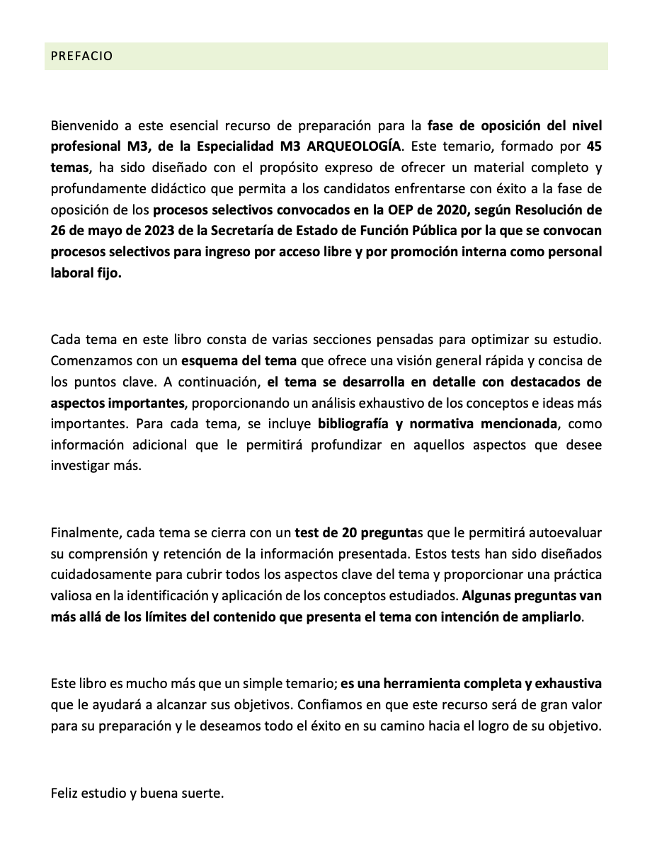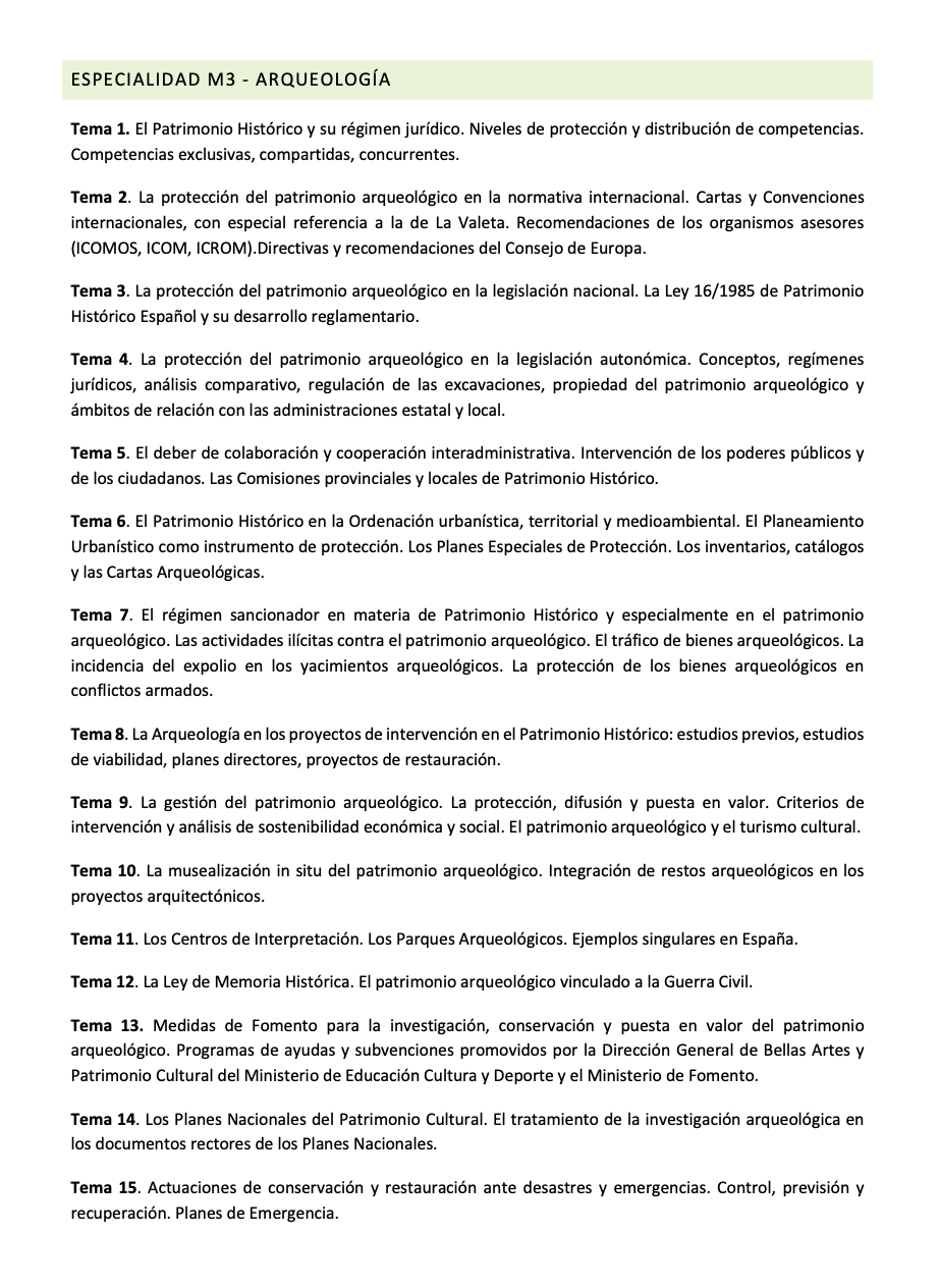 Este temario, formado por 45 temas, ha sido diseñado con el propósito expreso de ofrecer un material completo y profundamente didáctico que permita a los candidatos enfrentarse con éxito a la fase de oposición del proceso selectivo de la especialidad M3 – ARQUEOLOGÍA para ingreso por acceso libre y acceso por promoción interna como personal laboral fijo sujeto al IV Convenio colectivo único para el personal laboral de la Administración General del Estado.